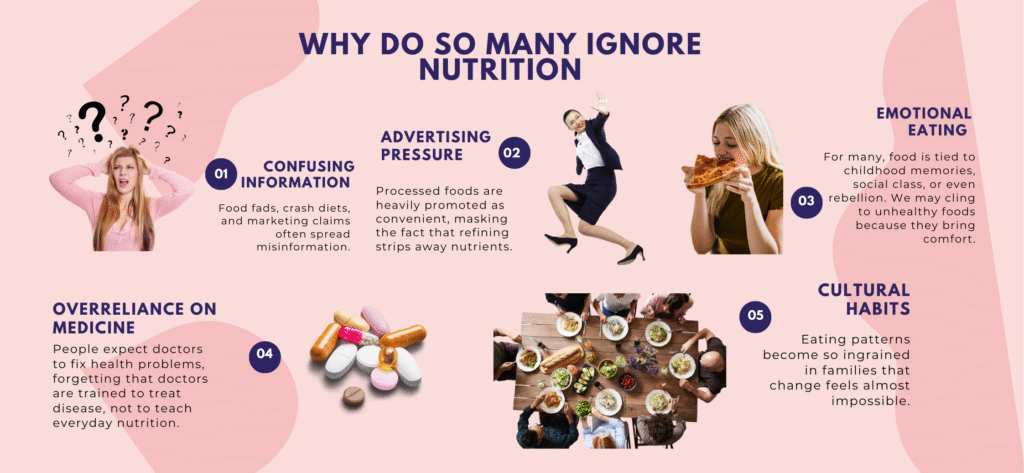 - Overreliance on Medicine – People expect doctors to fix health problems, forgetting that doctors are trained to treat disease, not to teach everyday nutrition.